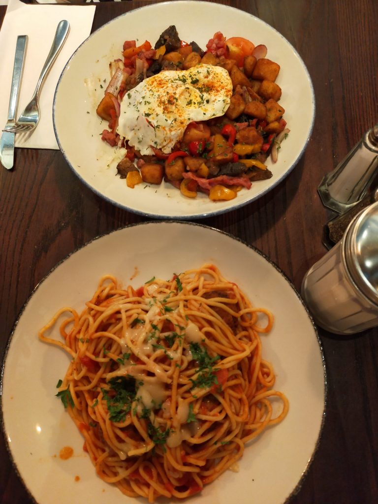 Both weren’t bad but nothing special. pan hash had pepper, egg, and pancetta. Spaghetti was a little over al dente. Meatballs were seasoned well with pork+beef but too soft.
