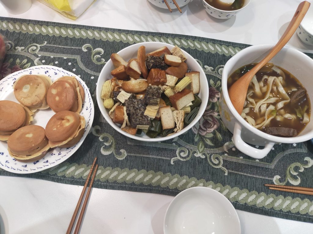 The middle dish is a mix of different types of tofu (bean curd) with baby corn, seaweed, and pig’s blood cake. Tofu comes in many forms in Taiwan depending on the process and cooking style. Baby corn is so good here. With a tropical climate, many fruits and veg are very tasty and delicious. The type of seaweed in this dish is a thicker kind that has been rolled up. I would say the texture is similar to broccoli core…? Pig’s blood is another typical Taiwanese food. This one is mixed into sticky rice, pressed into a sheet, then cut into squares. Animal products in Taiwan have very little to no unwanted gamy smell and taste, so pig’s blood products don’t have any irony feel or smell.