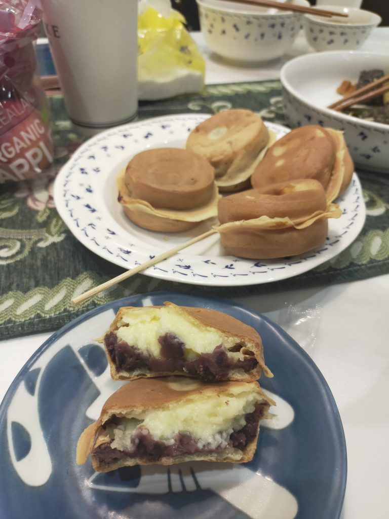 I wasn’t hungry but my gosh I missed these and ate. Going from the left, those circle things are Wheel Cakes. They are like a pancake kind of texture and taste but have a filling. They are made in a type of machine similar to those for making waffles. Typical fillings include red bean, taro, and mung bean. There are also savory fillings including shredded radish. These days, younger people prefer a cream filling. I’d say it’s kinda like a custard, but fluffy and lighter. The image on the right has red bean and cream.