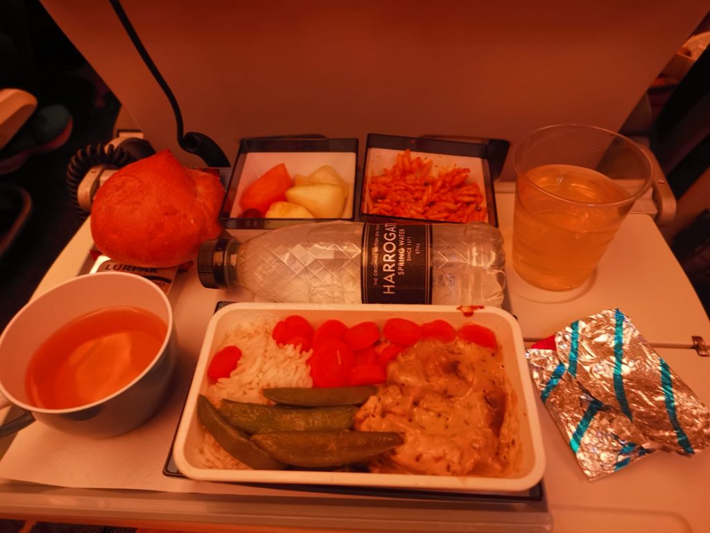 left: rice & chicken, it came with some kinda pasta side….? It was pretty ok for plane food, 5/10. The white wine is a no go though, 2/10.