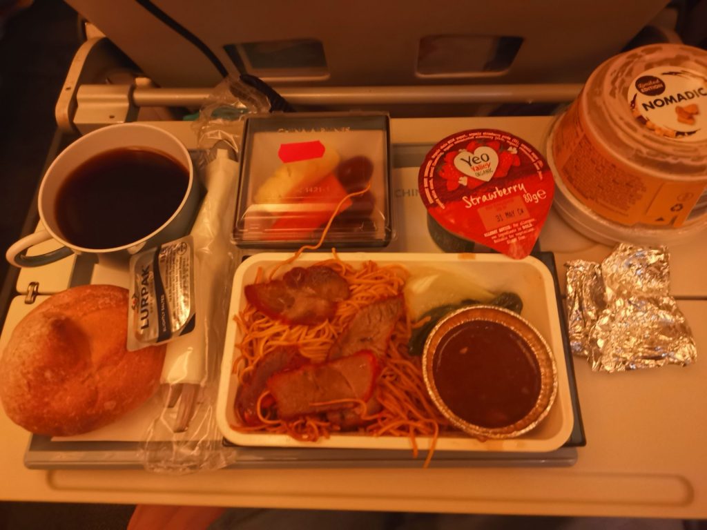 right: noodles & pork, better than the chicken&rice. 7/10 (for plane food)